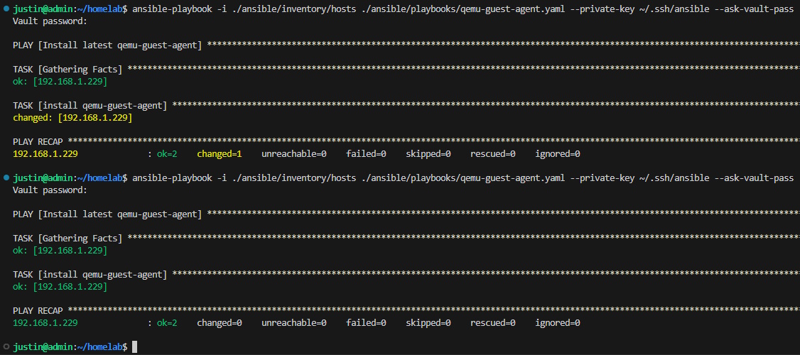 The most important line here is state: present. This instructs Ansible to make sure that the latest qemu-guest-agent package is installed. When we run this playbook for the first time, it will install the package and result in a 'changed' status and subsequent runs will result in the 'ok' status since the state is present as declared.