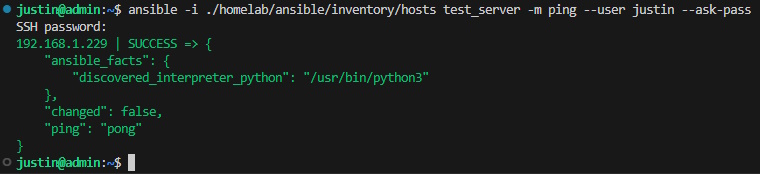 ansible -i ./ansible/inventory/hosts sandbox -m ping --user justin --ask-pass